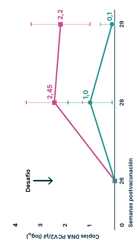 Estudio realizado con 2 grupos de tratamiento de 20 lechones. Vacunación a las 3 semanas de edad, y desafío antigénico 4 semanas después de la vacunación.