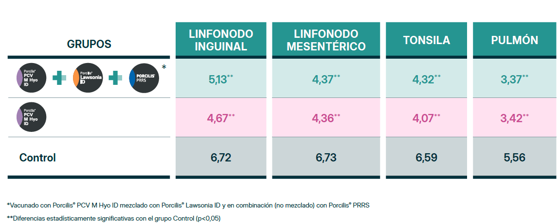Grupo control, Porcilis® Lawsonia ID con Porcilis® M Hyo ID dosis única y Porcilis® PRRS