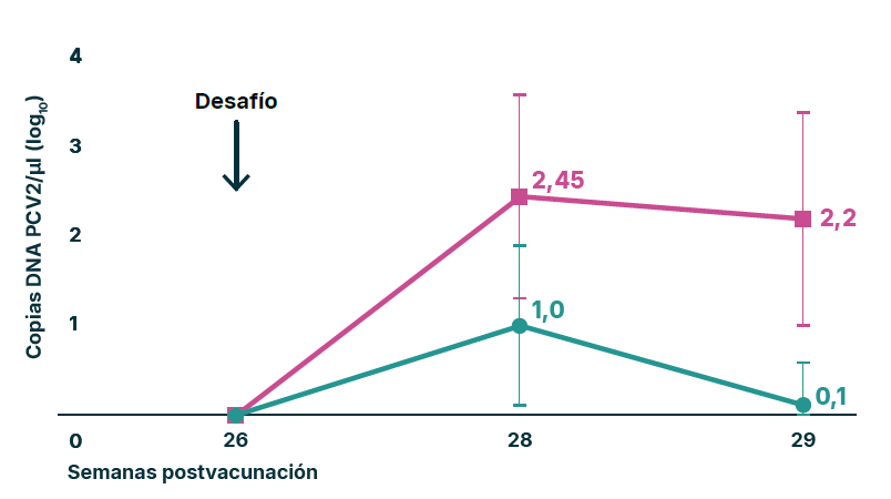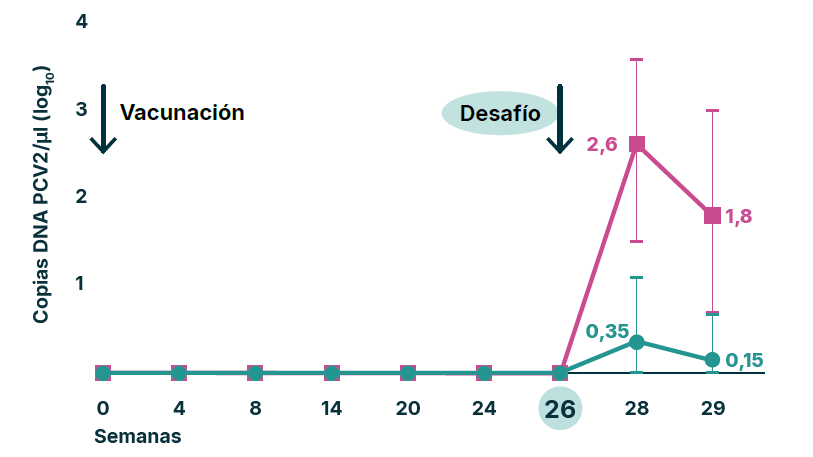 Estudio realizado con 2 grupos de tratamiento de 34 lechones. La vacunación se realizó a las 3 semanas de edad, el desafío tuvo lugar 26 semanas después de la vacunación.
