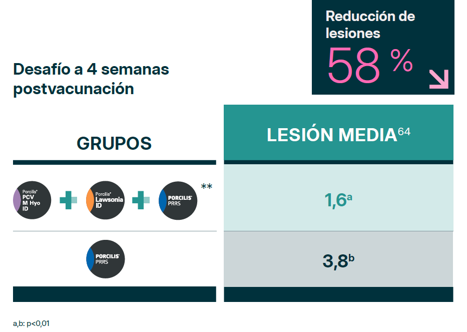 Los animales vacunados a las 3 semanas de edad con Porcilis® PRRS en uso simultáneo con Porcilis® PCV M Hyo ID que se mezcló con Porcilis® Lawsonia ID, fueron desafiados con virus del PRRS 4 semanas después de la vacunación y mostraron1,2: